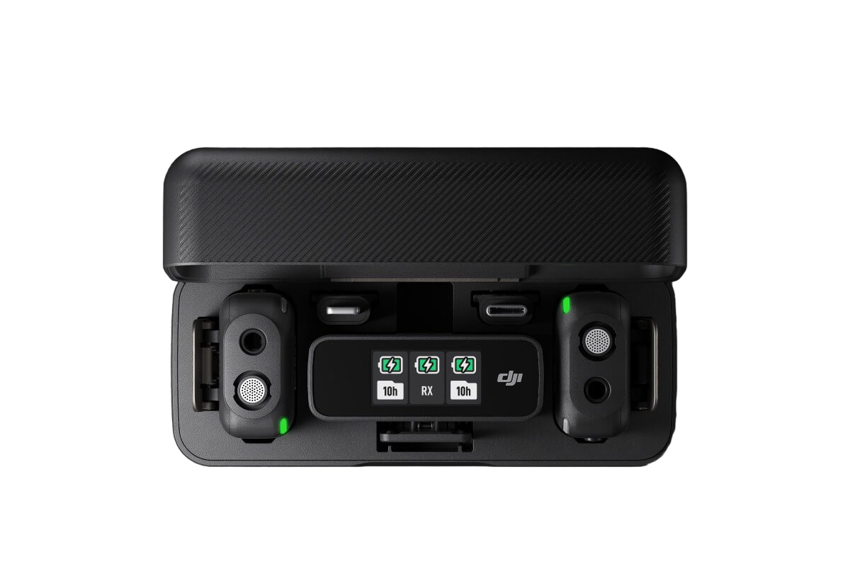 Микрофон DJI Mic оснащен двумя передатчиками, в каждый из которых встроен микрофон. Оба передатчика поддерживают всенаправленное аудио, что отлично подходит для интервью с несколькими людьми и выполнения небольших задач в студии.