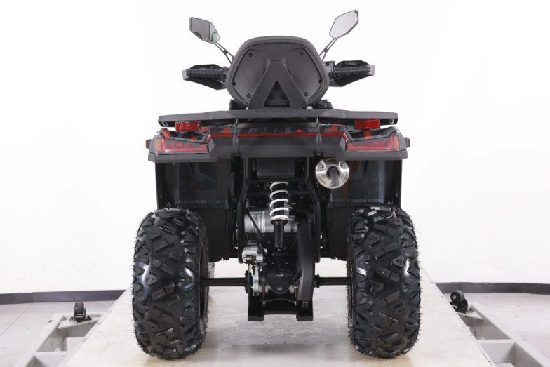 Передняя маятниковая (рычажная) подвеска обеспечивает отличную амортизацию и управляемость на неровной местности. С дорожным просветом в 150 мм и высотой по сидению 800 мм, квадроцикл подходит для пользователей ростом от 150 см, что делает его доступным для широкой аудитории.