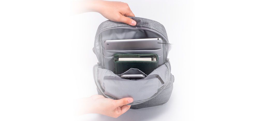 Внешне все довольно строго — серая меланжевая ткань, отсутствие декора, регулируемые лямки и большой карман для мелочей — спереди. Внутри — все тот же аскетизм, который, впрочем, не мешает организовать идеальное расположение всего необходимого. Для самого ценного предусмотрен карман для молнии, еще один — для телефона. И конечно несколько карманов без застежки, которые идеально подходят для хранения ноутбука.