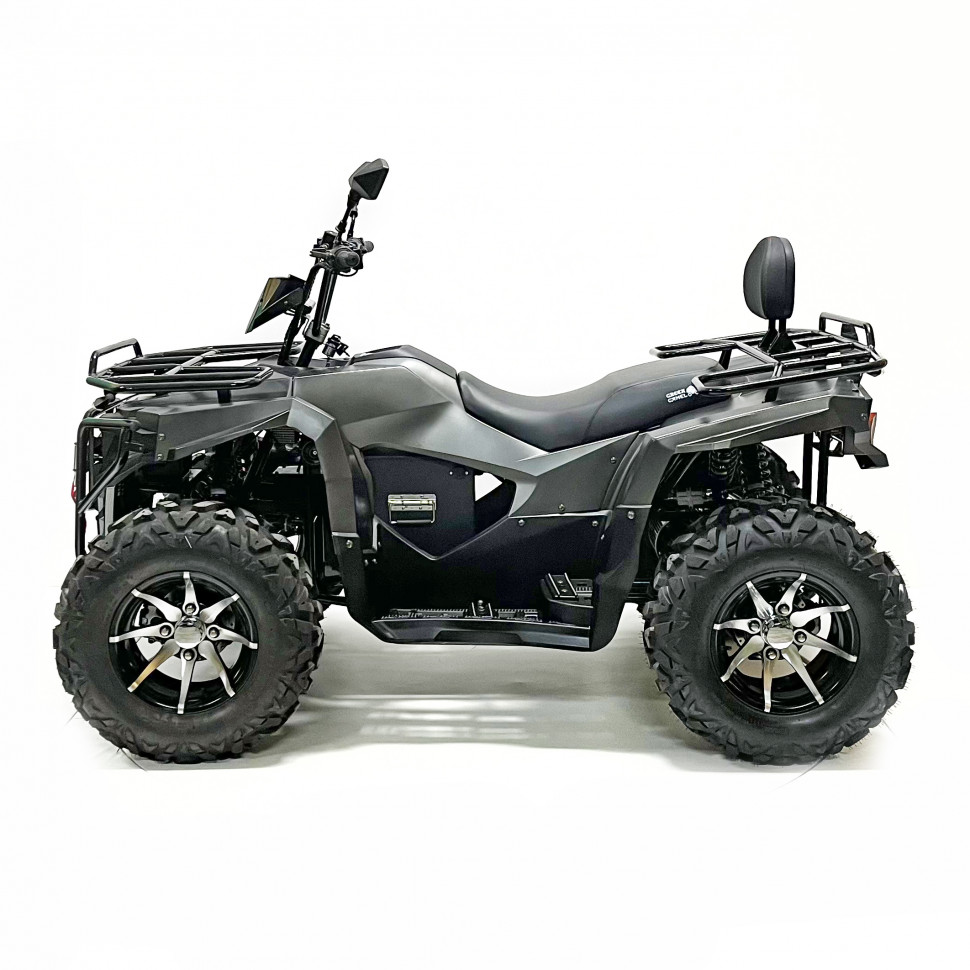 Шасси электроквадроцикла оснащено дифференциальной передачей и регулируемыми амортизаторами, что обеспечивает отличную управляемость и комфортную езду. Дисковые гидравлические тормоза на передних и задних колесах гарантируют надежное торможение, что повышает безопасность при движении по сложным маршрутам.