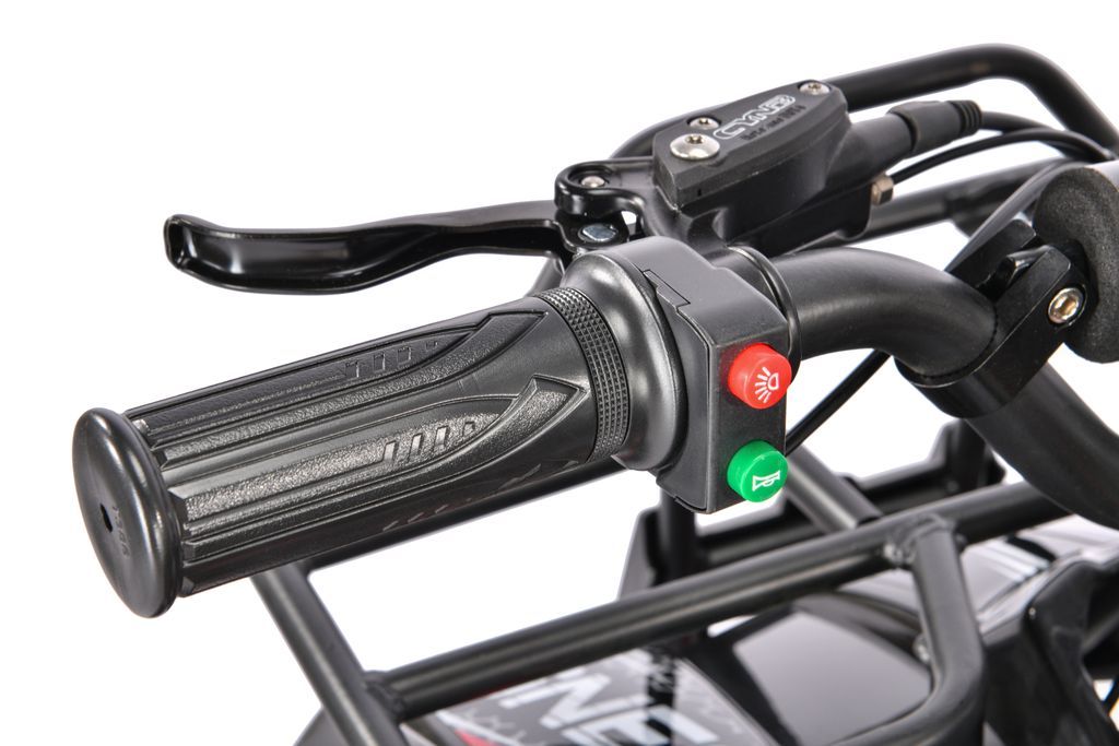 Квадроцикл имеет гидравлические дисковые тормоза спереди и сзади, что обеспечивает надежное и безопасное торможение. Ограничитель скорости позволяет контролировать скорость передвижения, что особенно важно для юных водителей.