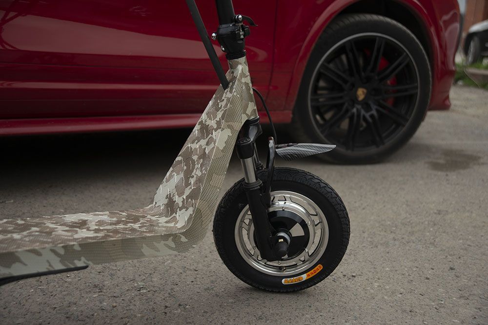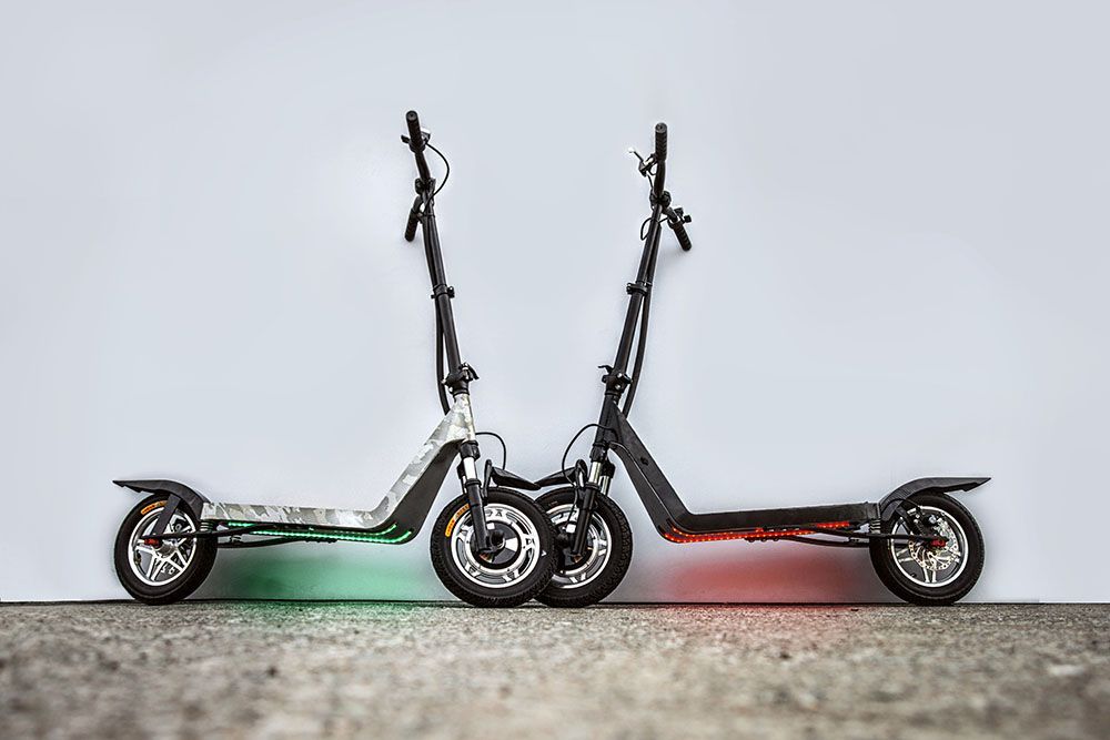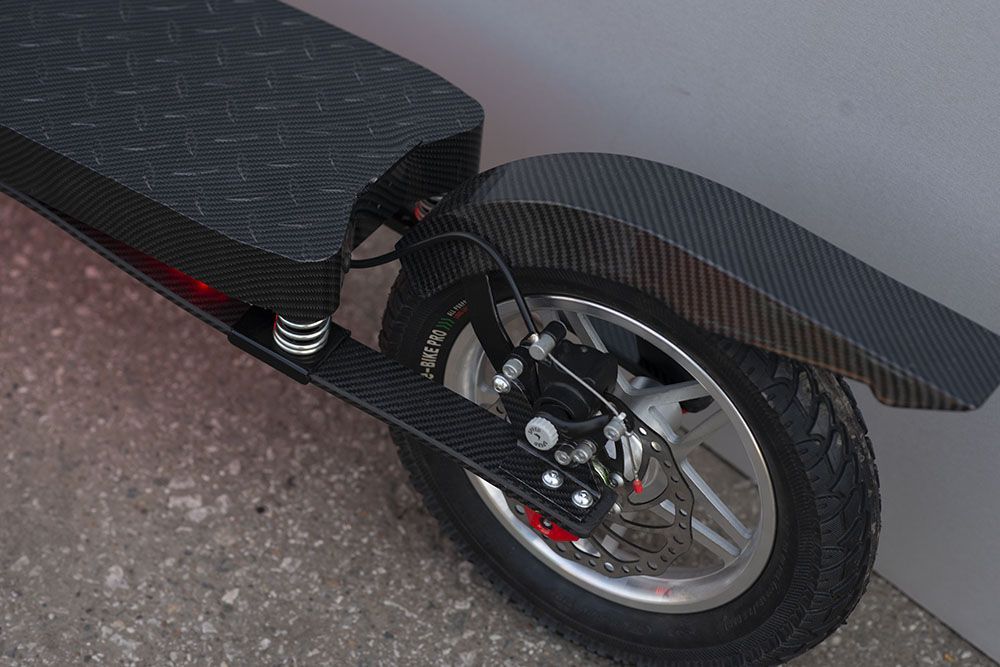 - Благодаря особому строению подвески - карбоновым рессорам в виде лучей лука и установленным сверху пружинам, на самокате можно подпрыгивать на высоту до полуметра!