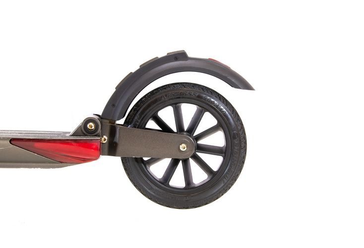 Амортизаторы спереди и сзади скрытые в корпусе самоката. Заднее колесо из мягкой резины дополнительно повышает комфорт при проезде мелких неровностей (брусчатка).