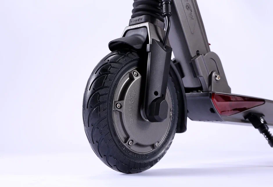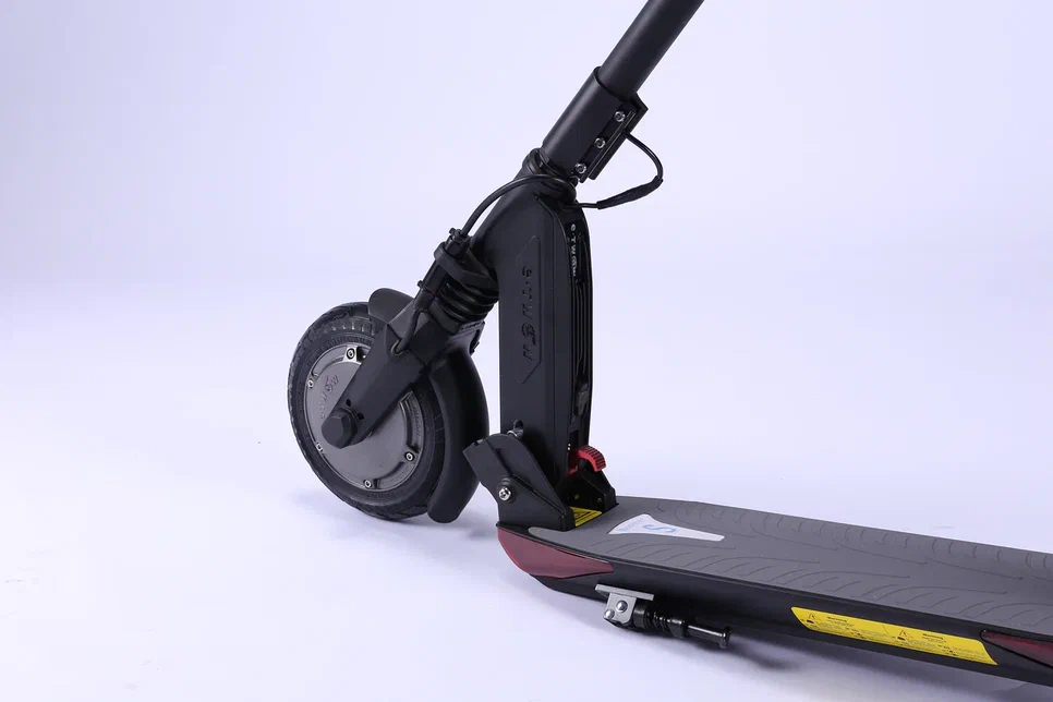 Электросамокат оснащен двухподвесной амортизацией, что обеспечивает комфортную езду по неровным дорогам. Привод на переднее колесо обеспечивает отличную управляемость и стабильность во время движения.