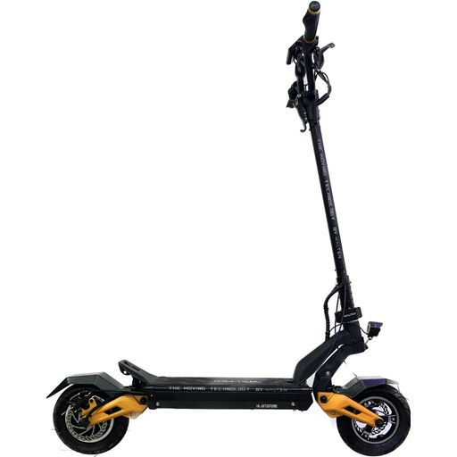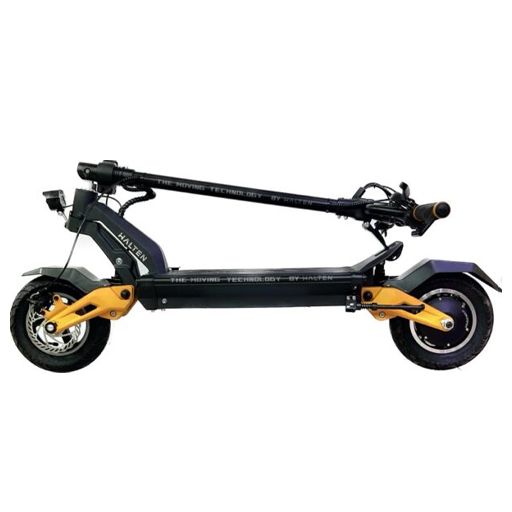 Электросамокат Halten Cross V.3 — имеет мощность двигателя 1560 Вт! Разгоняется до скорости 60 км/ч, уверенно проезжает 65 км, на одном заряде батареи 52B, 18Ah. Заряжается «до полного» за 9 часов. Безусловно модель рассчитана на взрослую аудиторию, максимальный вес, который выдержит электросамокат, 120 кг. Управление простое, необходимые данные выводятся на многофункциональном дисплее. Тормоза гидравлика, дисковые, дека устойчивая, есть передняя фара и стоп-сигнал — базовая безопасность у самоката для райдеров учтена. Что по габаритам: высота рулевой колонки классического размера 98 см, а вот дорожный просвет увеличенный 170 мм. Самокат показывает мягкий ход, за счёт надувных камерных колес диаметром 10 дюймов.