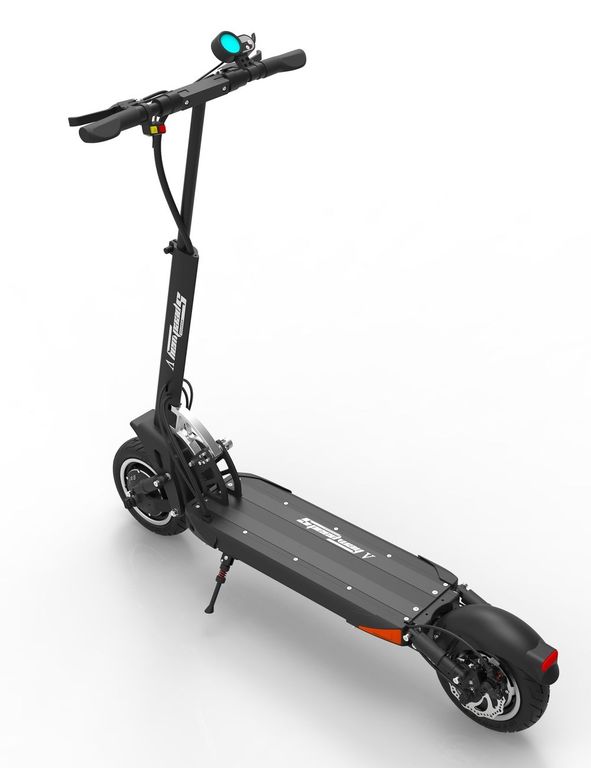 - На руле самоката расположен информативный дисплей с подсветкой, который также является компьютером, в котором можно производить настройки. Справа от дисплея находится курок газа