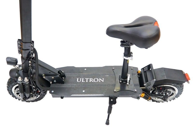 Мощная модель, созданная на базе самоката ULTRON T10. Устройство работает на двух мотор-колесах, которые в сумме выдают мощность 3200 Вт. Их достаточно, чтобы развить скорость до 70 км/ч. Техника предназначена для передвижения в городских условиях и по бездорожью. При этом сиденье в конструкции создает удобство при поездке на дальние расстояния.