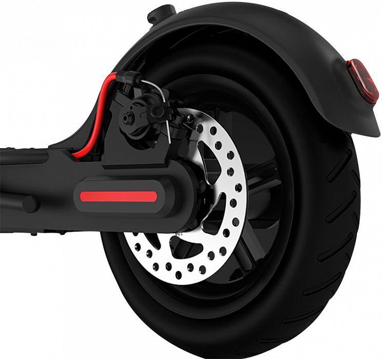 Классический черный цвет с красными вставками. Лаконичный дизайн делает электросамокат еще более стильным. Будь то в потоке или на стоянке возле офиса — он выглядит просто великолепно.