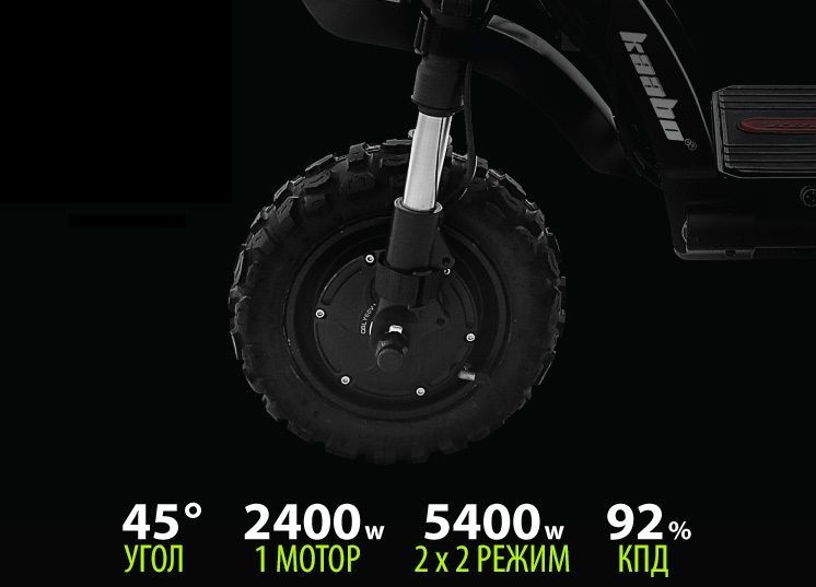 - В базовой комплектации компания KAABO устанавливает аккумулятор ёмкостью 35Ah/60V. В экономном режиме по ровной поверхности он позволяет проезжать до 150 км. При езде по пересеченной местности расход электроэнергии у батареи увеличивается в зависимости от угла подъема, ускорений и т.д.