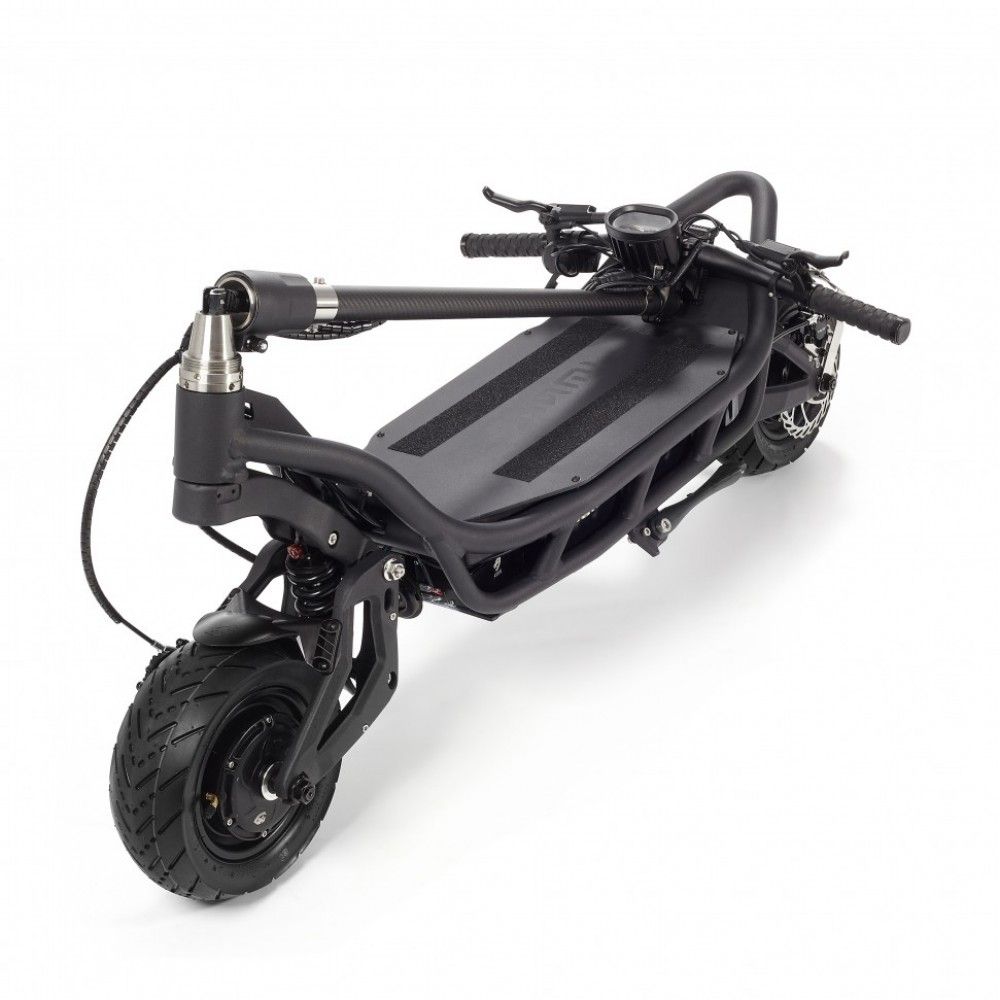 Аккумулятор 72В32Ач с фирменными ячейками обеспечивает запас хода до 100 км в режиме с включенным энергосбережением. Два двигателя общей пиковой мощностью 1500 Вт позволяют самокату разгоняться до 140 км/ч! 11-дюймовые прокачанные колеса, на которые насажены огромные тормозные диски с гидравлической системой гарантируют безопасное торможение в экстремальных ситуациях.