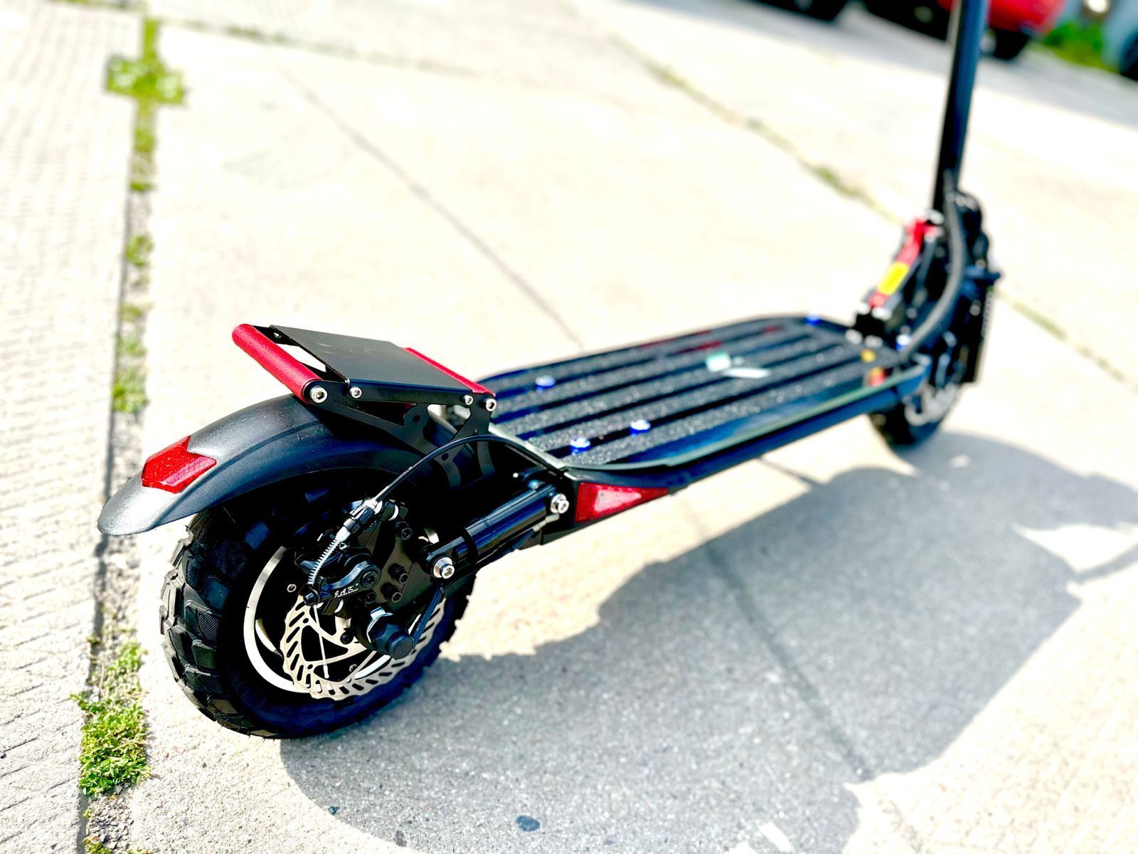 Как говорилось ранее, модель оснащена электродвигателем мощностью 1000 Вт, который расположен в заднем колесе. Вместе с контроллером на 25А и аккумулятором с напряжением 60V самокат творит чудеса. Ни один "одноклассник" не может похвастаться таким набором скорости и такой тягой в горку. Даже с большим весом райдера самокат быстро разгоняется и уверенно везет даже в затяжные подъемы.