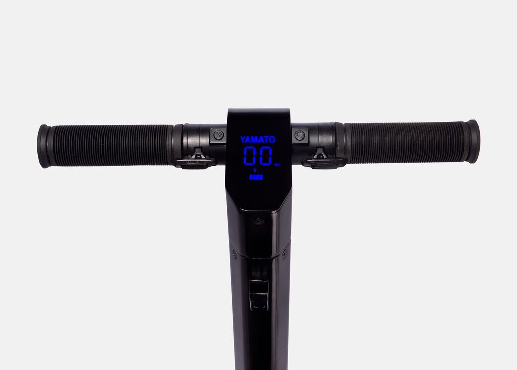 - Самокат имеет удобную парковочную подножку, рычаги газа и тормоза, разноцветную подсветку и дисплей, а также синхронизируется с собственным приложением YAMATO, в котором можно настроить самокат под себя.