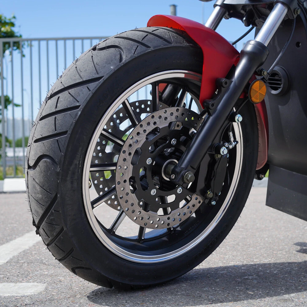 Уникальность E3000 начинается с земли — с его колес. Нестандартная комбинация размеров (переднее 140/70-17 и особенно массивное заднее 215/40-13) редко встречается в сегменте, что сразу выделяет аппарат. Эти шины выполняют три ключевые функции: они обеспечивают огромное пятно контакта с асфальтом для безупречного сцепления, визуально усиливают мощь задней части и, благодаря низкому профилю задней покрышки, передают малейшие нюансы покрытия, сохраняя при этом курсовую устойчивость. Такая конфигурация — прямая отсылка к драгстерским и кастомным построениям, где заднее колесо является смысловым центром.