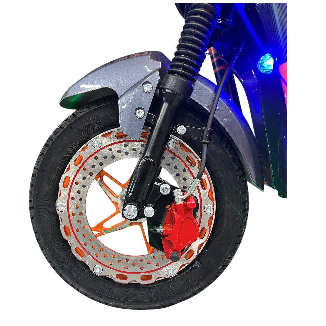 Электроскутер также оснащен функцией заднего хода, что делает его маневренным и удобным для парковки в ограниченных пространствах. Гидравлические дисковые тормоза спереди и сзади обеспечивают надежное и безопасное торможение, что особенно важно при высоких скоростях и в сложных условиях.