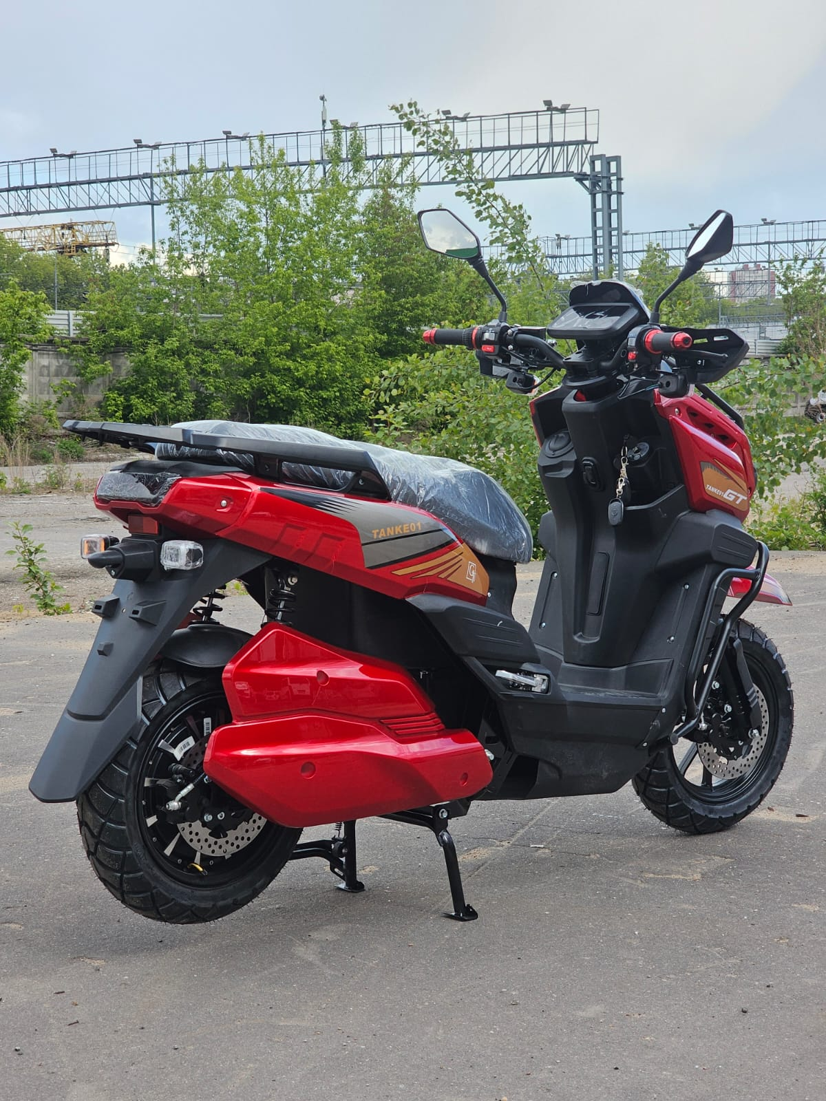 Впечатляющая передняя часть с двумя круглыми фарами, обрамленными защитными элементами, придает скутеру агрессивный и технологичный вид. Насыщенные оттенки и графические элементы с логотипом "TANK" делают этот скутер заметным и подчеркивают его спортивный характер.