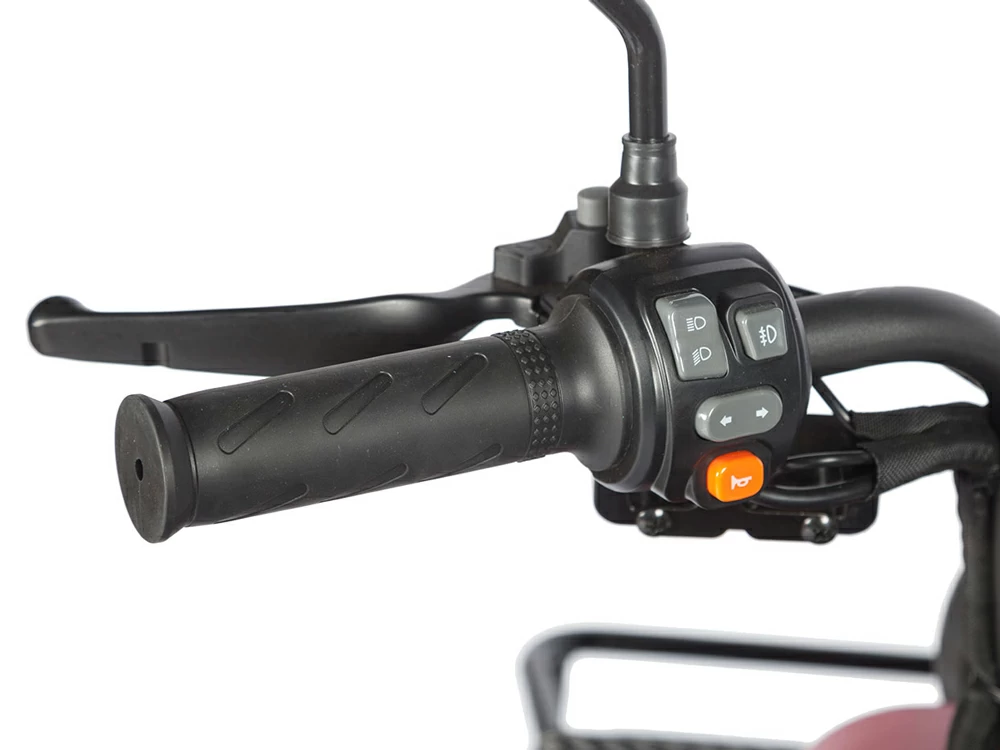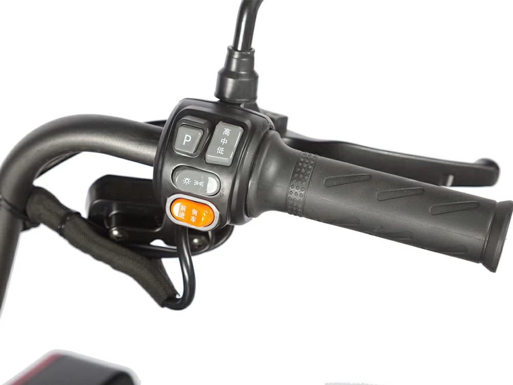 Электротрицикл также оборудован зеркалами заднего вида, звуковым сигналом и поворотниками, что значительно повышает уровень безопасности на дороге. LCD-дисплей информирует водителя о текущем состоянии трицикла, включая уровень заряда аккумулятора и скорость движения.