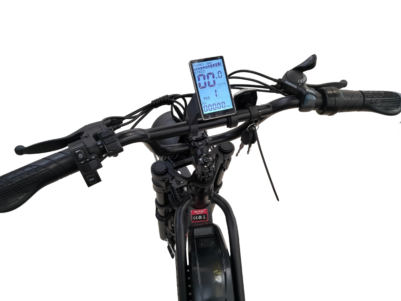 Электродвигатель мощностью 1000 Вт питается от аккумулятора напряжением 48 В и емкостью 18200 мА·ч, обеспечивая максимальную скорость до 40 км/ч. Интеллектуальная система управления режимами езды встроена в ручку, позволяя быстро переключать уровни помощи в зависимости от дорожной ситуации. Бортовой компьютер отображает скорость, уровень заряда и другую полезную информацию.