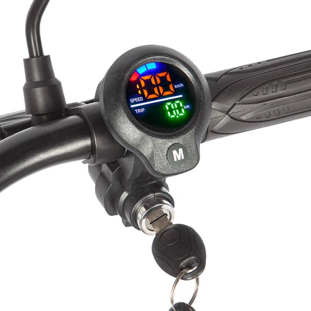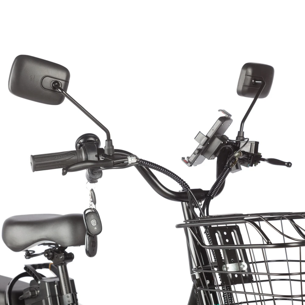 Электровелосипед оборудован передним барабанным тормозом и задним дисковым гидравлическим тормозом, что обеспечивает надежное и быстрое торможение. Эта комбинация гарантирует безопасность при любых условиях движения, позволяя уверенно контролировать скорость.