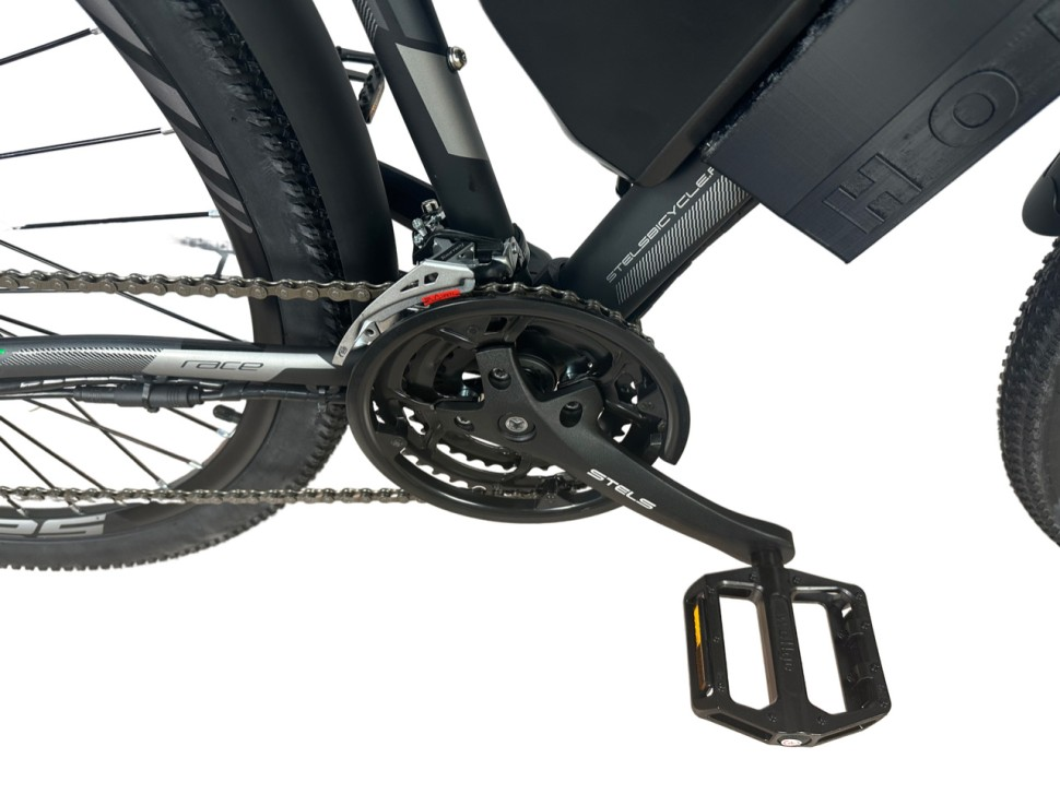 Система Prowheel с тремя звездами (42/34/24) и кассета Shimano TZ500-6 (14-28T) делают этот электровелосипед универсальным для любых маршрутов, будь то городские улицы или загородные дороги.