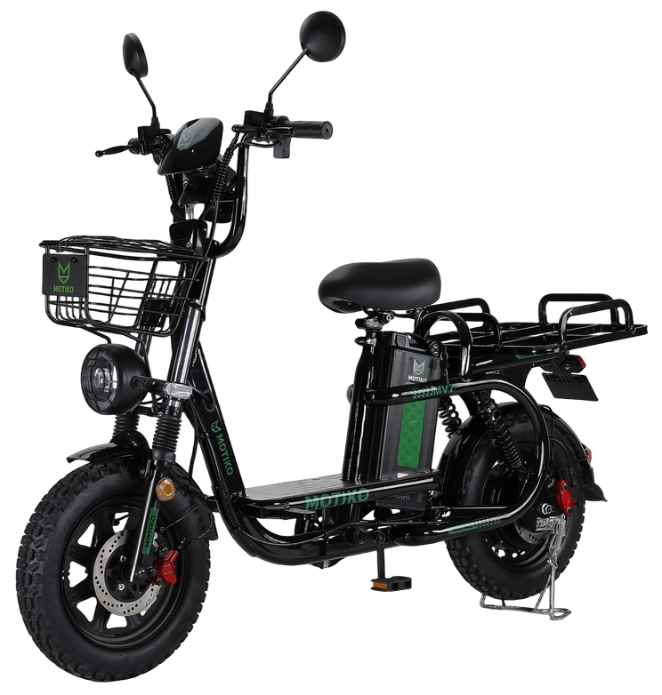 Максимальная скорость 50 км/ч и грузоподъемность 150 кг делают MOTIKO MV7 Pro универсальным транспортным средством для города и пригорода. Стильный черно-зеленый дизайн с декоративными элементами привлекает внимание и подчеркивает индивидуальность владельца. Модель сочетает надежность компонентов, комфорт езды и современный внешний вид для требовательных пользователей.