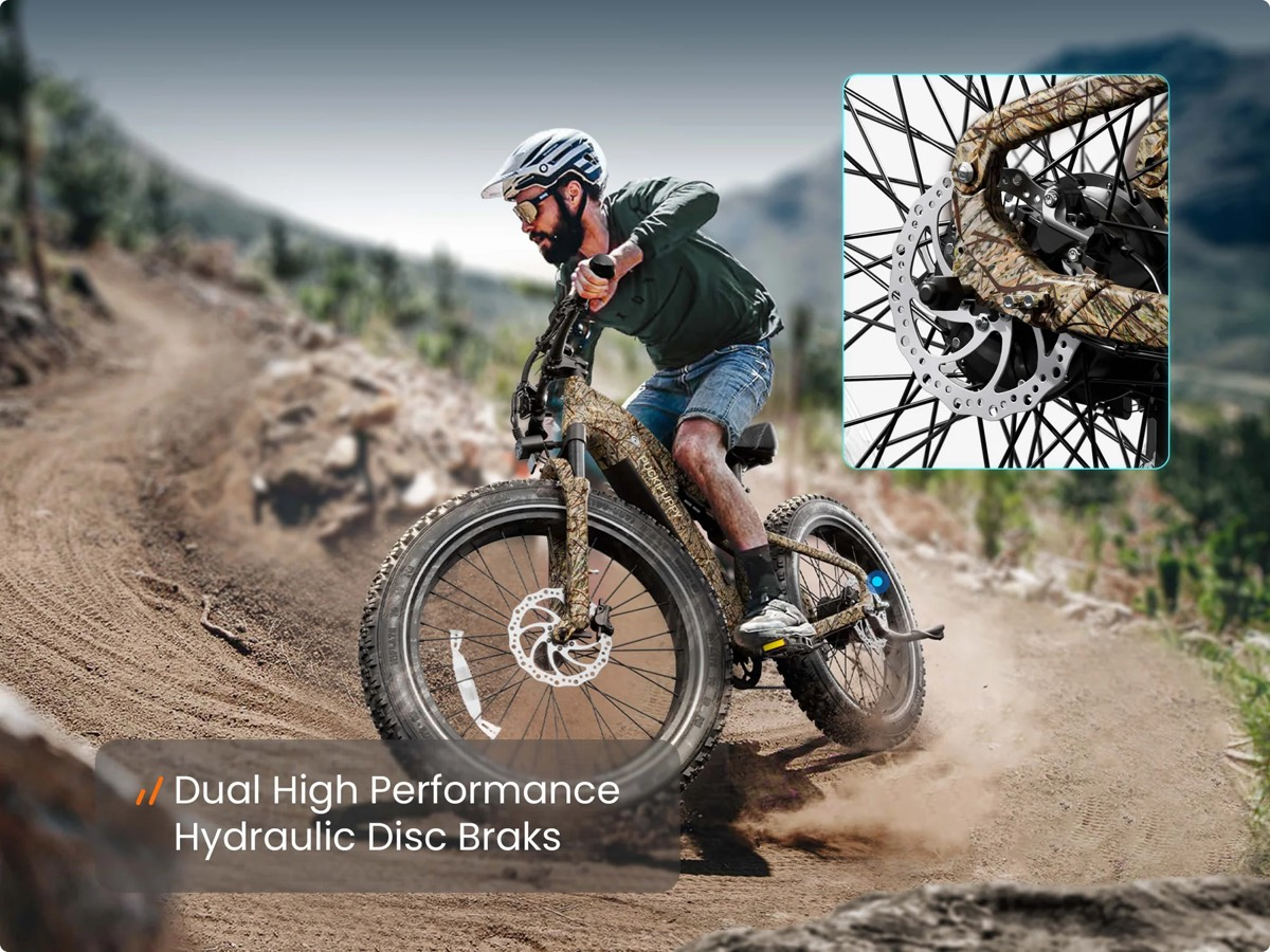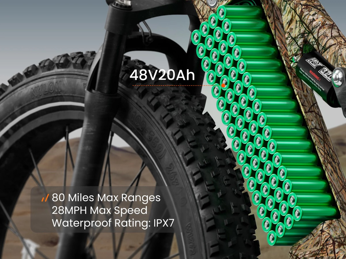 26-дюймовые колёса с широкими покрышками толщиной 4 дюйма созданы для езды по бездорожью. Они уверенно идут по песку, снегу, грязи и гравию, не проваливаясь и не теряя сцепления. Агрессивный протектор обеспечивает надёжное сцепление с любыми поверхностями — от мокрого асфальта до рыхлого грунта. Большой диаметр колёс помогает легко преодолевать ямы, корни и камни, делая поездку комфортной даже на самых сложных участках.