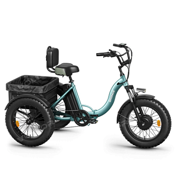 Все три колеса имеют диаметр 20 дюймов с шириной покрышек 4 дюйма, что относится к категории fatbike и обеспечивает уверенное передвижение по различным типам покрытия. Широкие шины создают низкое удельное давление на грунт, предотвращая проваливание в песок, снег и болотистую почву. Увеличенная площадь контакта с дорогой повышает устойчивость и снижает риск заноса на скользких поверхностях.