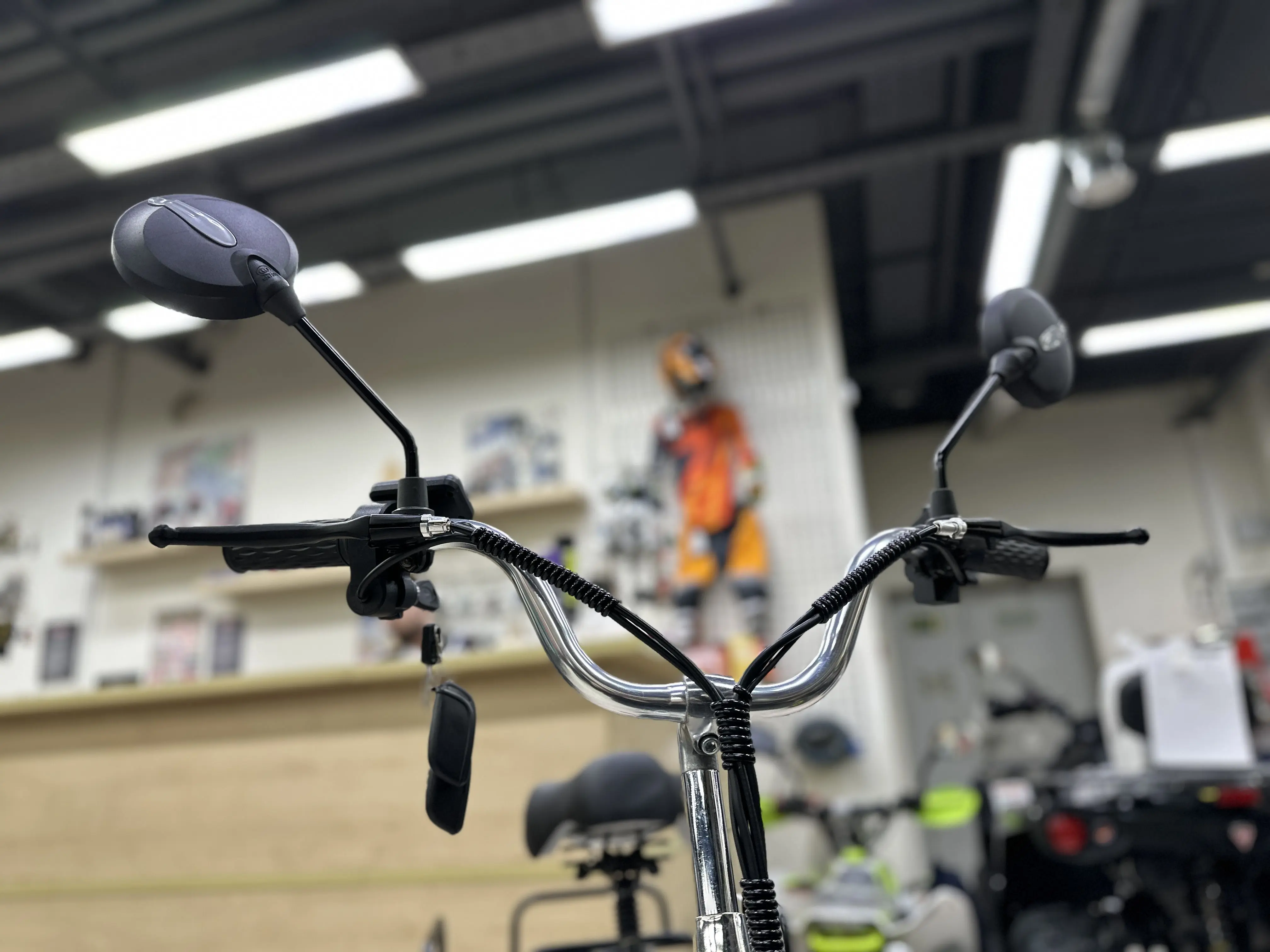 Амортизационная вилка спереди хорошо справляется со всеми неровностями на дороге. С помощью зеркал заднего вида вам будет удобно смотреть, кто едет позади вас. Барабанные тормоза сделают остановку безопасной и плавной.