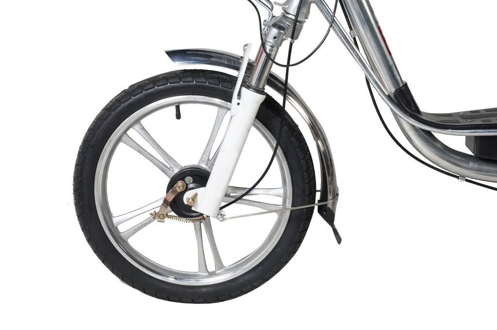 - Спереди установлена вилка, которая сглаживает неровности и позволяет наслаждаться комфортной плавной ездой. А также продлевает срок службы электровелосипеда, снижая воздействия от вибрации и ударов.