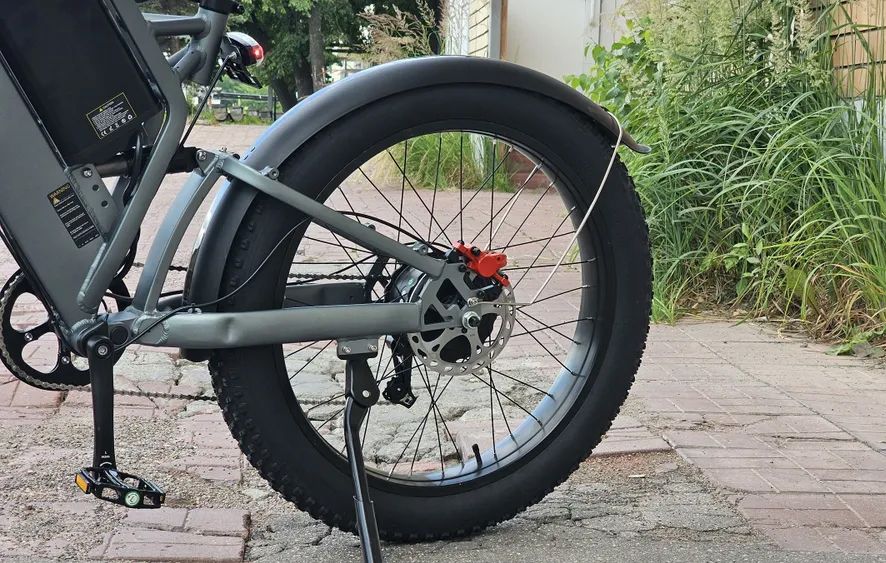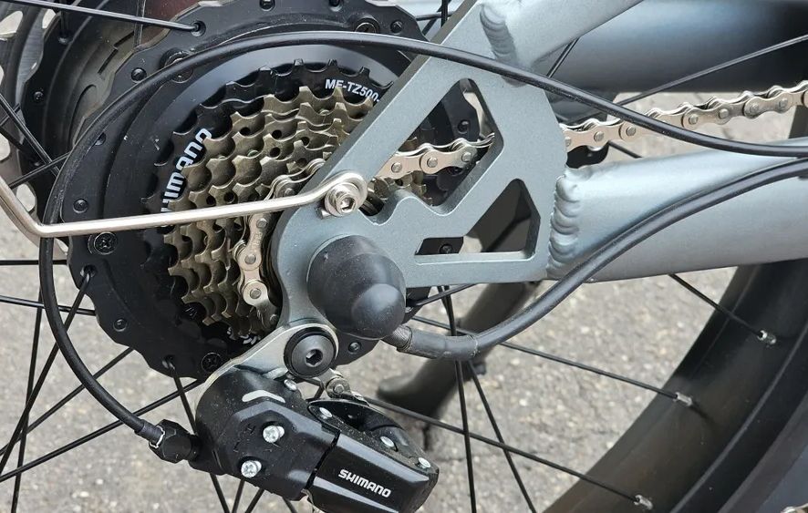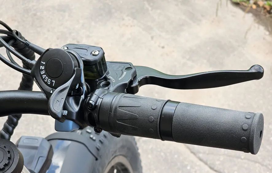 Гидравлические тормоза на задних колесах обеспечивают надежное и плавное торможение, что делает поездки более безопасными. На руле расположены все элементы управления, включая ручку газа, ручку тормоза и дисплей, который отображает скорость, уровень заряда аккумулятора и пробег.