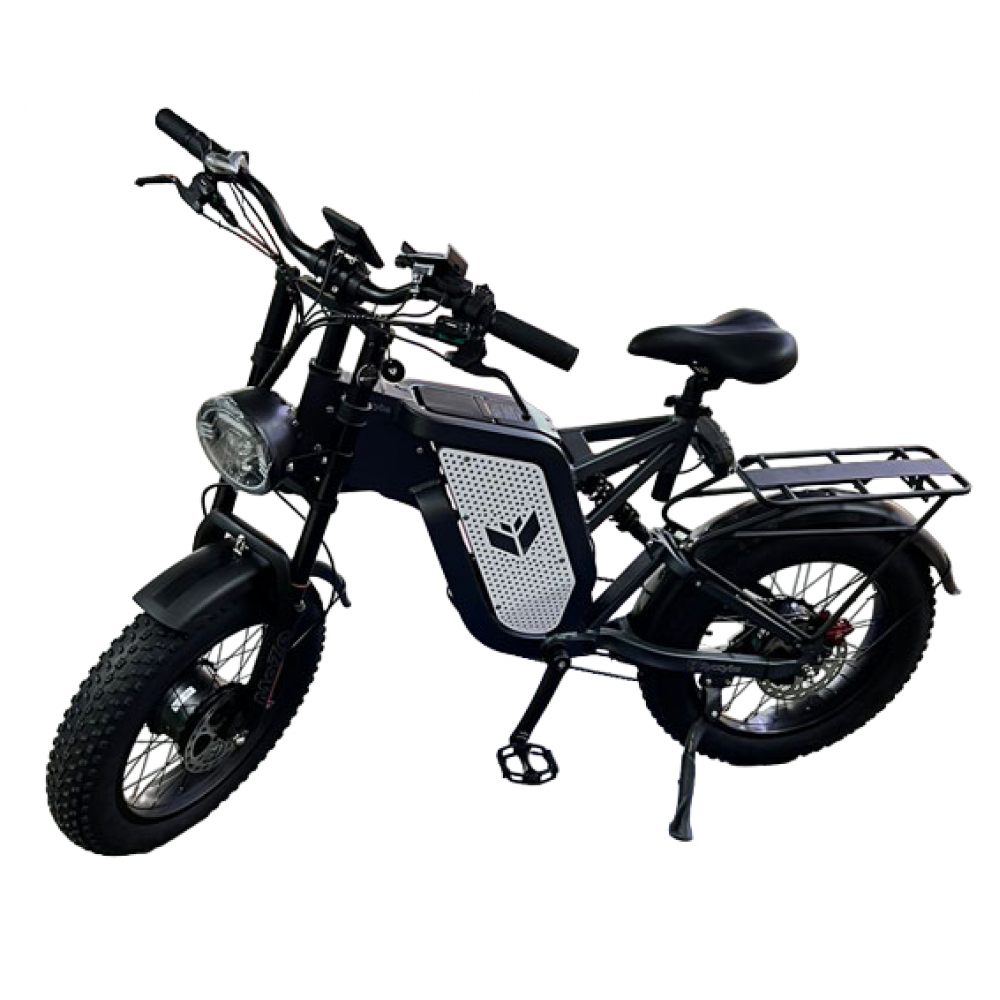 Электровелосипед оснащен 20-дюймовыми колесами, которые обеспечивают устойчивость и хорошее сцепление с дорогой. Цельная алюминиевая рама делает конструкцию прочной и легкой, а двухподвесная система амортизации смягчает удары при движении по неровным поверхностям. Это позволяет уверенно передвигаться как по городу, так и по пересеченной местности.