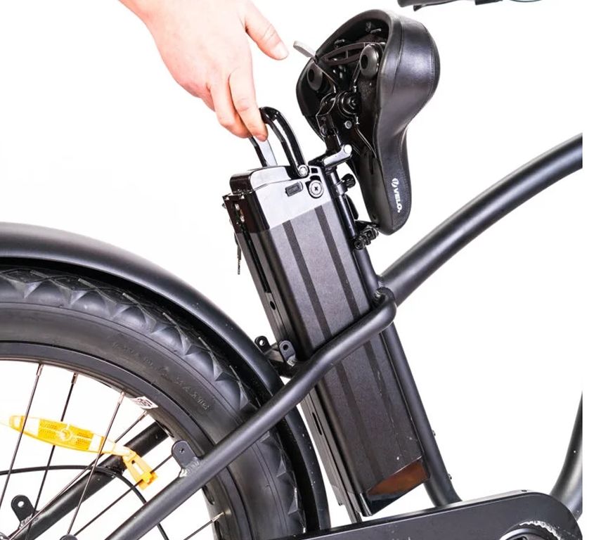 Батарея собрана из ячеек LG, имеет номинальное напряжение 48 В и ёмкость 13 Ач, благодаря чему запас хода на одном заряде достигает 50 км. В комплекте с велосипедом идёт зарядное устройство, которое питается от обычной сети 220 В, а на полную зарядку потребуется 8-10 часов. На батарее имеется встроенный индикатор - при нажатии на кнопку загорается светодиод, отражающий степень заряда. Кроме этого, на крышке находится разъём для подключения зарядного устройства и замок, который блокирует батарею.С правой стороны батареи расположен предохранитель, который в случае необходимости легко извлекается при помощи крестообразной отвёртки, и USB-разъём, чтобы вы всегда смогли подзарядить ваш телефон, словно от большого пауэрбанка. Разъём закрывается герметичной резиновой заглушкой, для исключения попадания влаги.