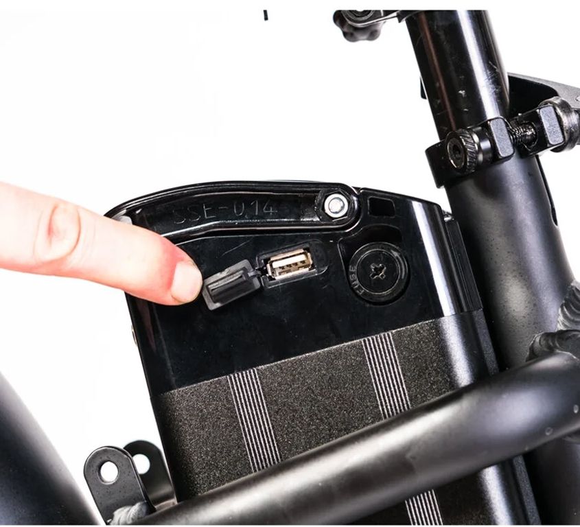 Батарея собрана из ячеек LG, имеет номинальное напряжение 48 В и ёмкость 13 Ач, благодаря чему запас хода на одном заряде достигает 50 км. В комплекте с велосипедом идёт зарядное устройство, которое питается от обычной сети 220 В, а на полную зарядку потребуется 8-10 часов. На батарее имеется встроенный индикатор - при нажатии на кнопку загорается светодиод, отражающий степень заряда. Кроме этого, на крышке находится разъём для подключения зарядного устройства и замок, который блокирует батарею.С правой стороны батареи расположен предохранитель, который в случае необходимости легко извлекается при помощи крестообразной отвёртки, и USB-разъём, чтобы вы всегда смогли подзарядить ваш телефон, словно от большого пауэрбанка. Разъём закрывается герметичной резиновой заглушкой, для исключения попадания влаги.