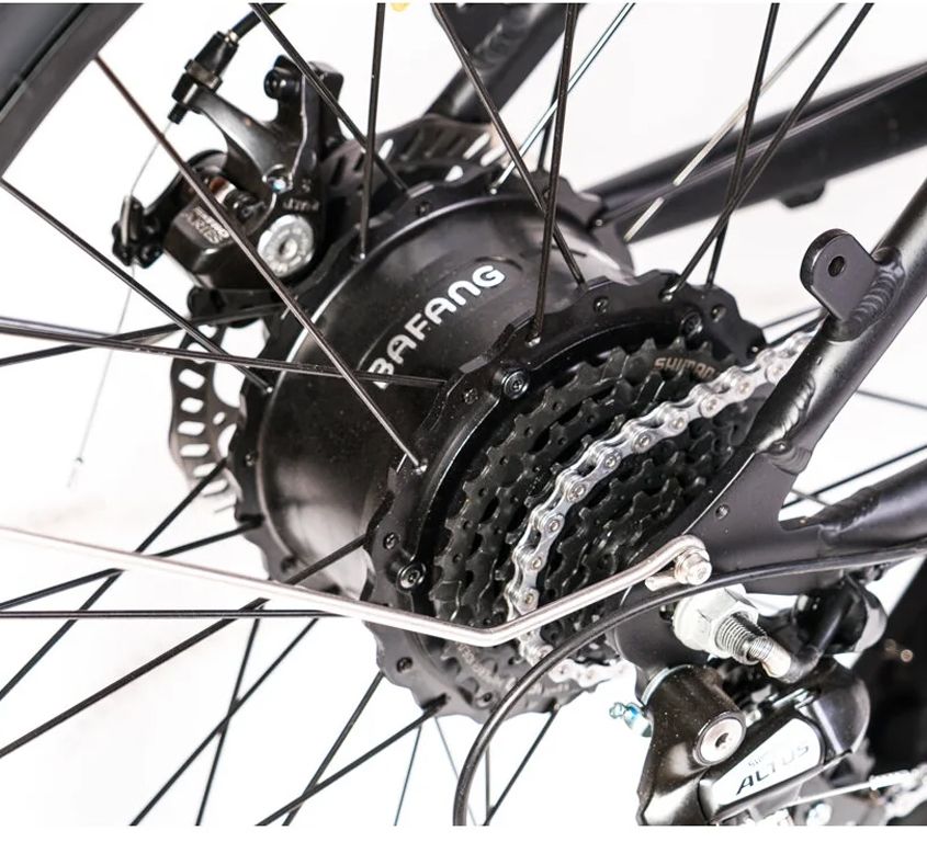В заднем колесе расположен надёжный редукторный мотор Bafang. Он не подвержен перегреву, благодаря чему имеет практически неограниченный ресурс. Мощности 750 Вт вполне достаточно для динамичного разгона до максимальной скорости, которая составляет 45 км/ч.Литий-ионный аккумулятор электровелосипеда разместился сразу за подседельной трубой. Несмотря на то, что он расположен внутри рамы, его можно легко извлечь - например, чтобы занести домой и поставить на зарядку. Для этого достаточно нажать на рычаг, расположенный под седлом, а затем просто откинуть седло и поднять аккумулятор за ручку. Установка батареи на место осуществляется так же легко, благодаря направляющим на раме. Контроллер управления двигателем разместился внутри рамы под батареей, так что он не заметен и надёжно защищён.