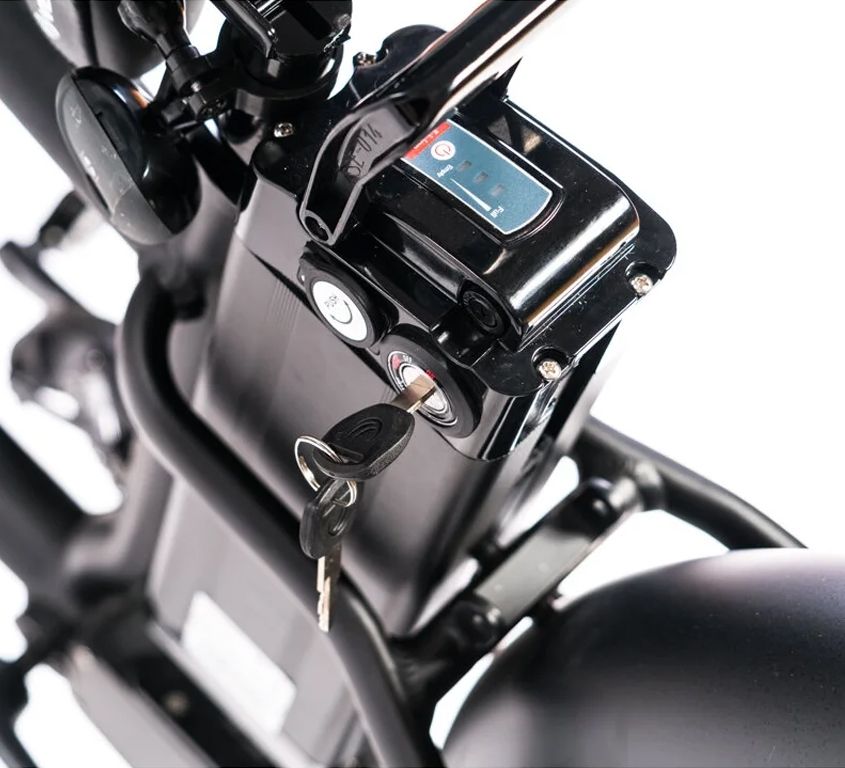Батарея собрана из ячеек LG, имеет номинальное напряжение 48 В и ёмкость 13 Ач, благодаря чему запас хода на одном заряде достигает 50 км. В комплекте с велосипедом идёт зарядное устройство, которое питается от обычной сети 220 В, а на полную зарядку потребуется 8-10 часов. На батарее имеется встроенный индикатор - при нажатии на кнопку загорается светодиод, отражающий степень заряда. Кроме этого, на крышке находится разъём для подключения зарядного устройства и замок, который блокирует батарею.С правой стороны батареи расположен предохранитель, который в случае необходимости легко извлекается при помощи крестообразной отвёртки, и USB-разъём, чтобы вы всегда смогли подзарядить ваш телефон, словно от большого пауэрбанка. Разъём закрывается герметичной резиновой заглушкой, для исключения попадания влаги.
