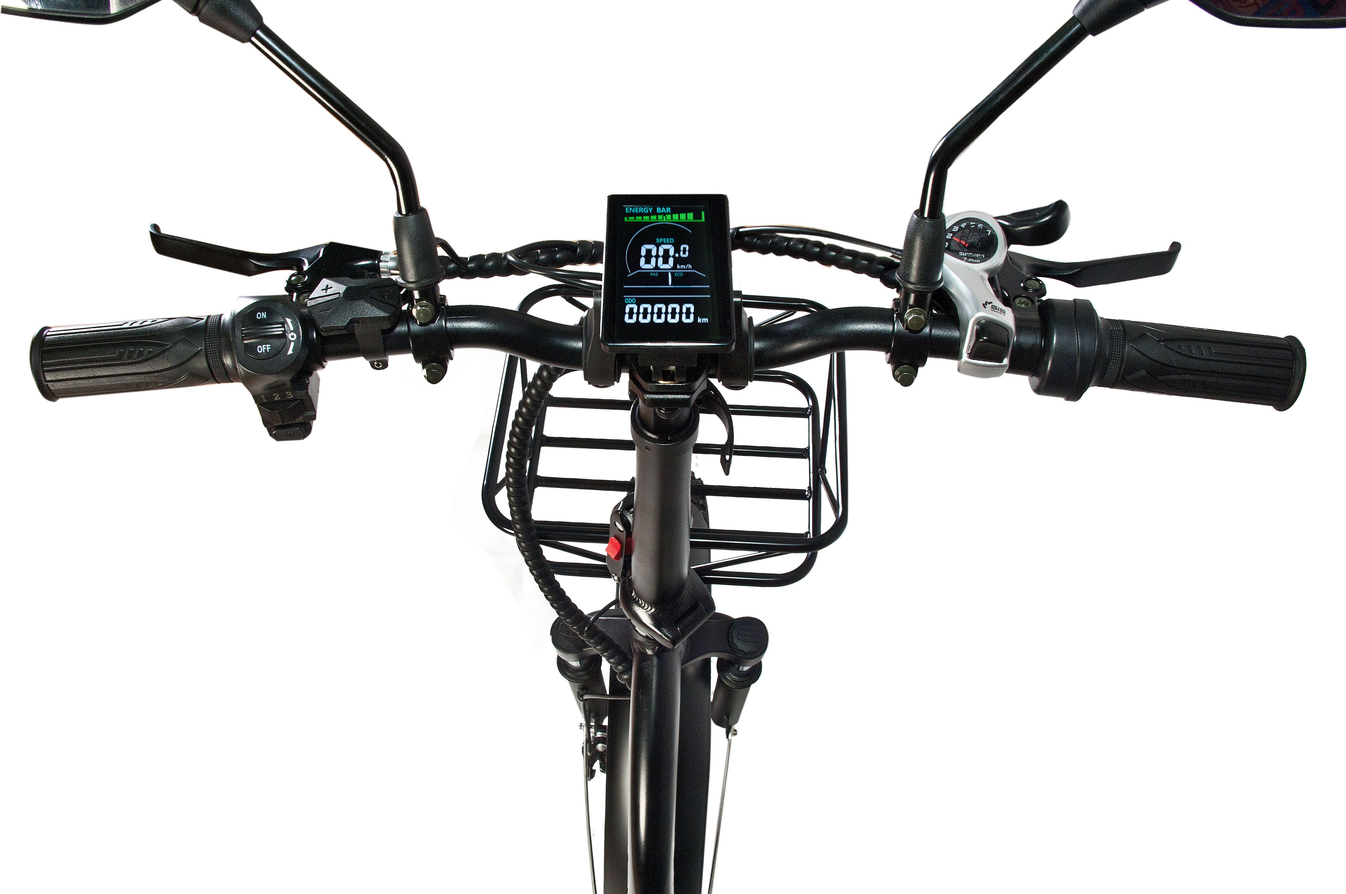 Электровелосипед имеет низкую раму, что обеспечивает удобство посадки и высадки. Это особенно важно для городских условий, где частая остановка и старт могут быть неудобными. Современный бортовой компьютер, расположенный по центру, позволяет легко отслеживать скорость, уровень заряда батареи и другие параметры, что делает управление более удобным и интуитивным.