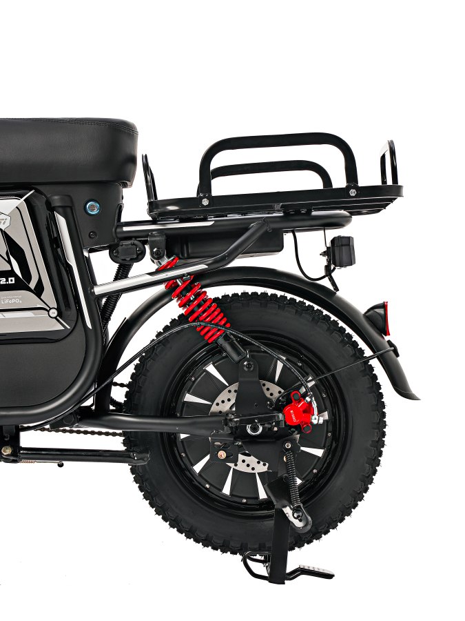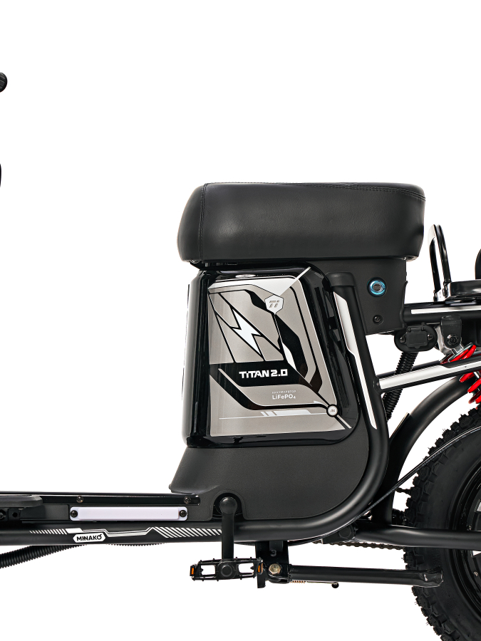 Minako Titan 2.0 оснащен высокоэффективной батареей 60V 30Ah LifePo4 (железофосфат), которая обеспечивает долгий срок службы и стабильную работу. Зарядное устройство с мощностью 5A позволяет быстро заряжать аккумулятор, а полное время зарядки составляет всего 6 часов. Максимальная нагрузка в 150 кг делает этот электровелосипед универсальным для различных пользователей.