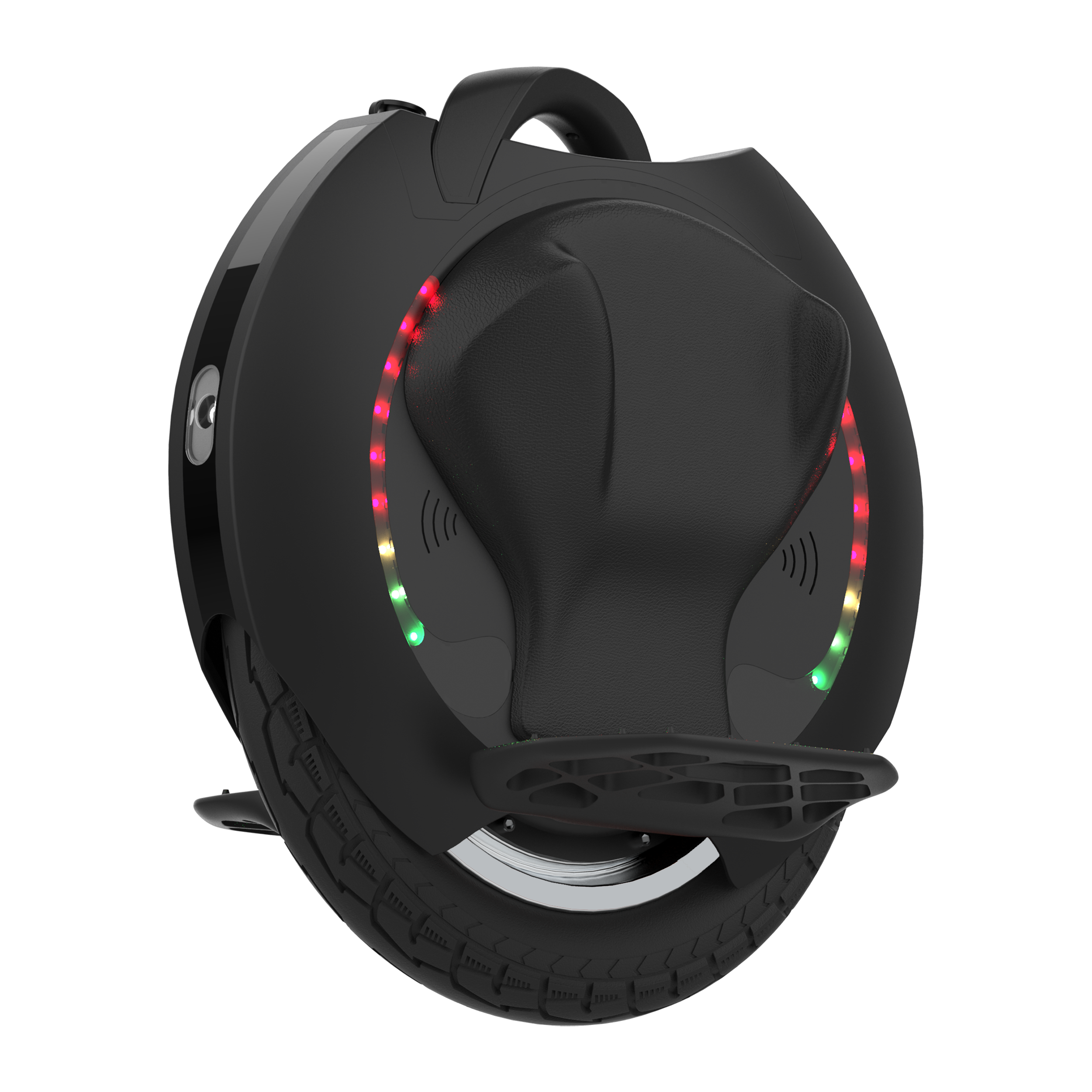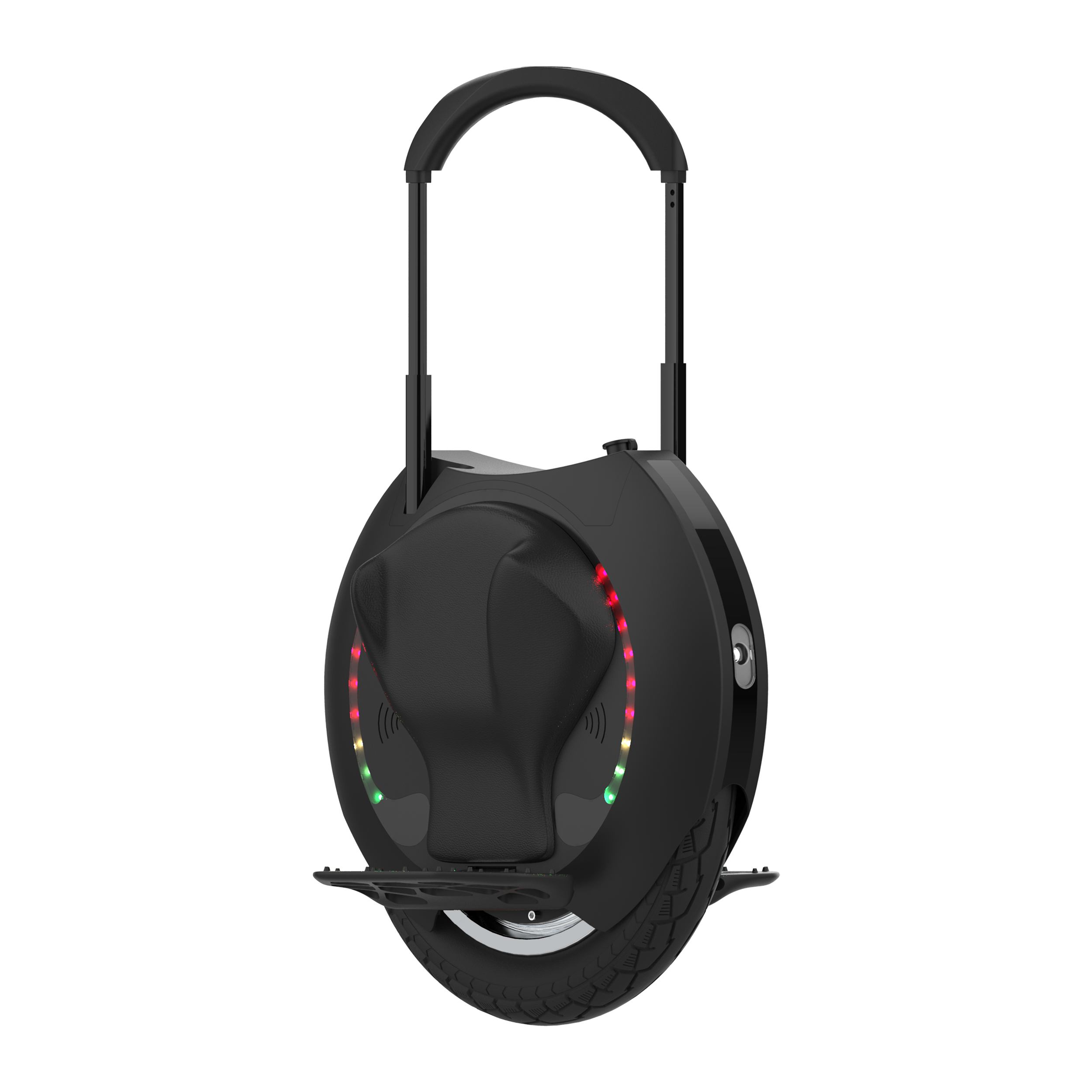- Алюминиевые подножки с прорезиненным покрытием и боковые подушечки на корпусе обеспечивают комфорт во время езды на моноколесе. Для большей компактности во время транспортировки подножки складываются.