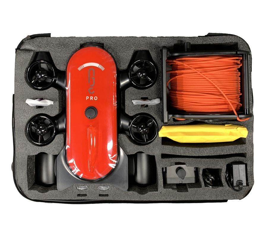 Камера подводного драна снимает видео с помощью двух светодиодных прожекторов, которые в сумме дают 3000 люмен, плюс можно установить любой из двух включенных цветовых корректирующих фильтров на его 160-градусный объектив F2.5 (для сохранения снимков без искусственного освещения. от синего или зеленого). Кадры записываются в разрешении 4K, а также транслируются по кабелю связи/управления дрона со скоростью 1080p/30 кадров в секунду. *Роботизированная рука поставляется отдельно.
